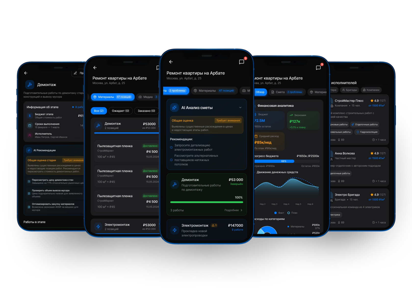 Мы объединили в одном месте всё, что нужно для прозрачной стройки — от смет до аналитики и контроля. Платформа анализирует данные с помощью искусственного интеллекта и помогает предотвращать перерасход бюджета ещё до того, как он случится.